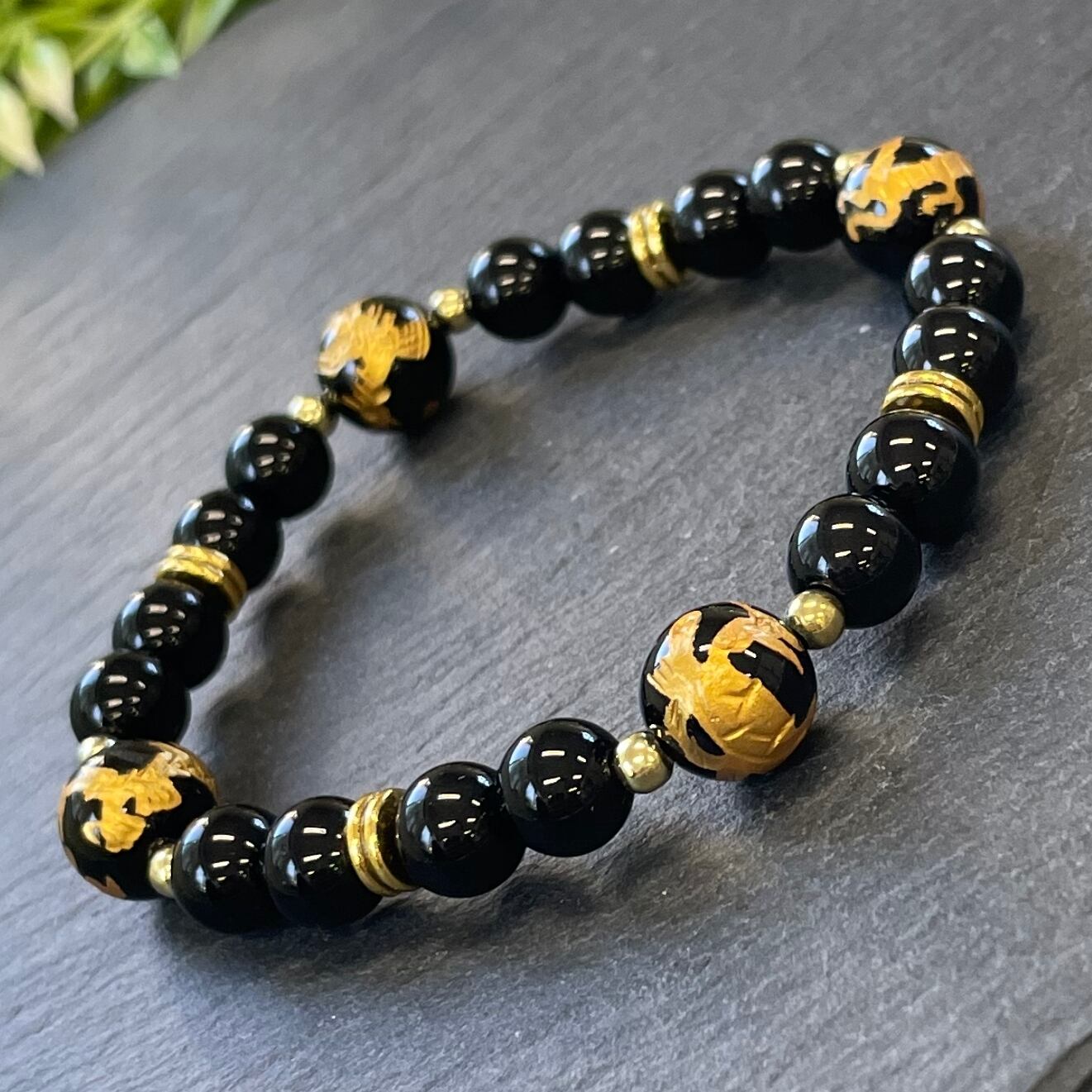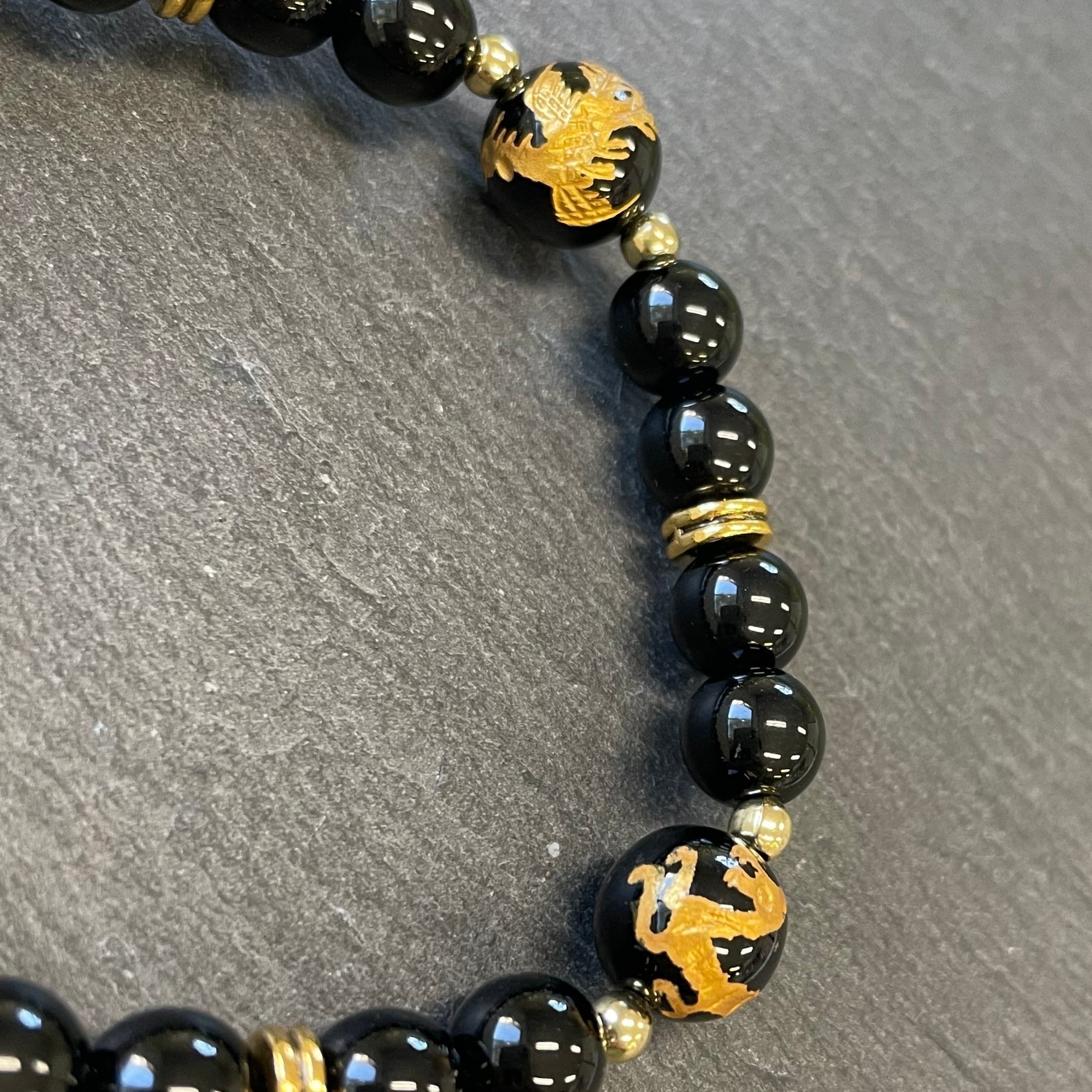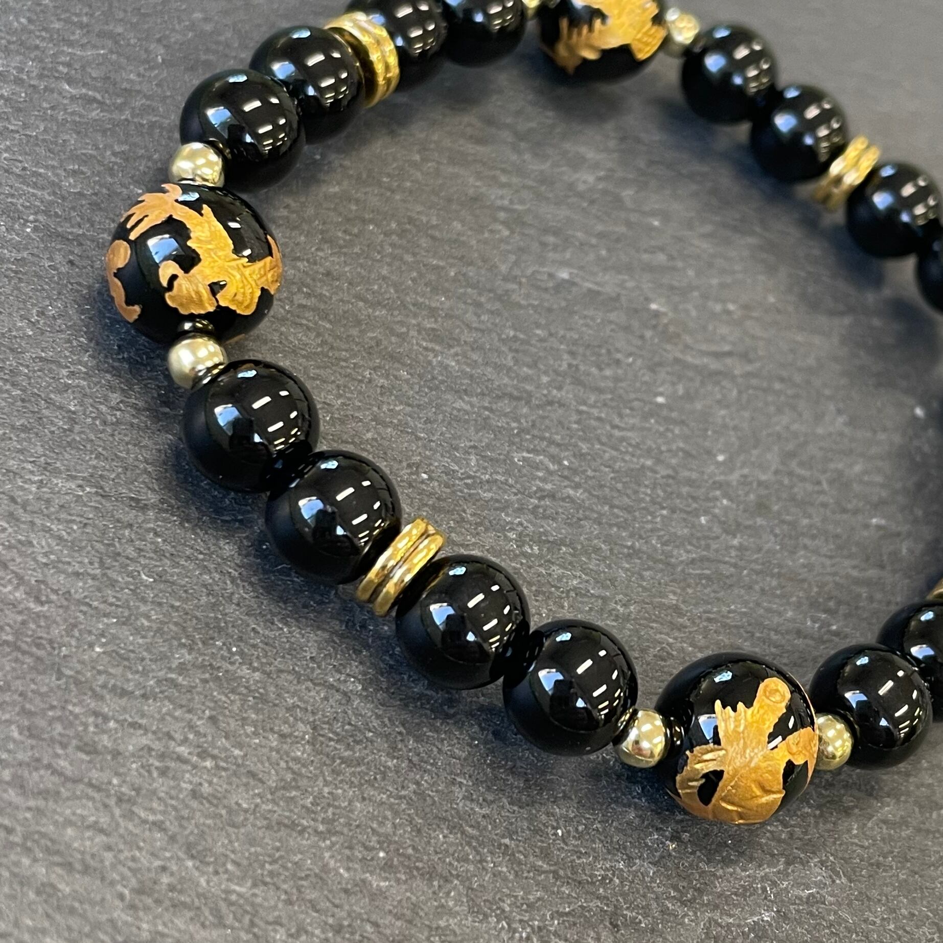 ●素材:ブラックオニキス 四神カービング彫り 10mm 丸玉8mm ロンデル 金メッキ玉 オペロンゴム使用