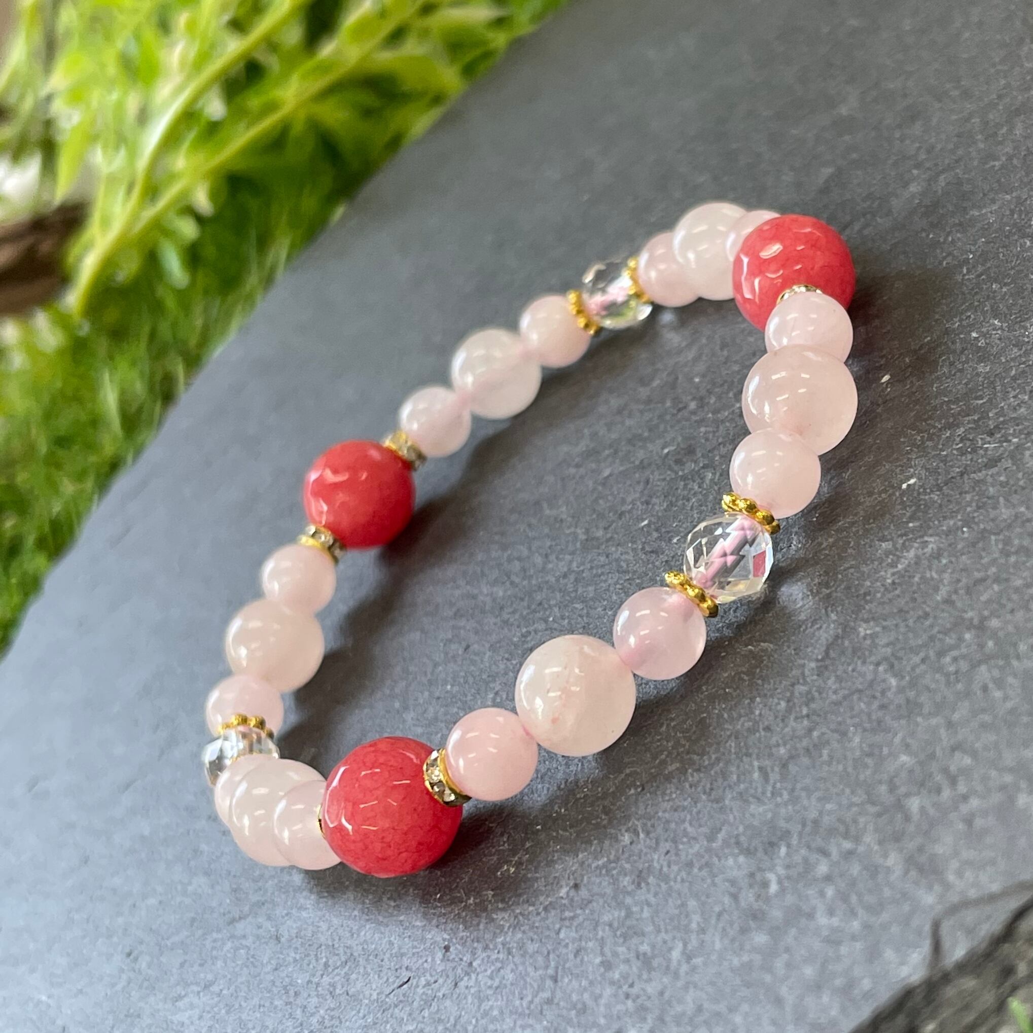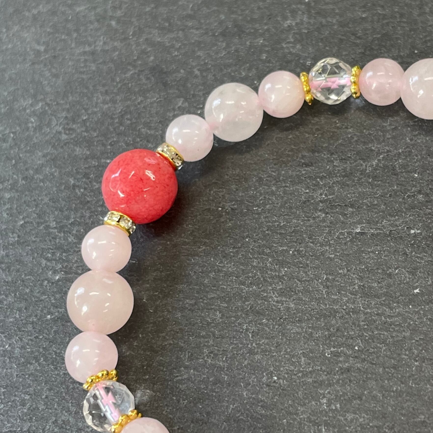 ●素材:ピンクジェイド カット 10mm ローズクォーツ 8mm 6mm 水晶 カット 6mm ロンデル デイジー オペロンゴム使用